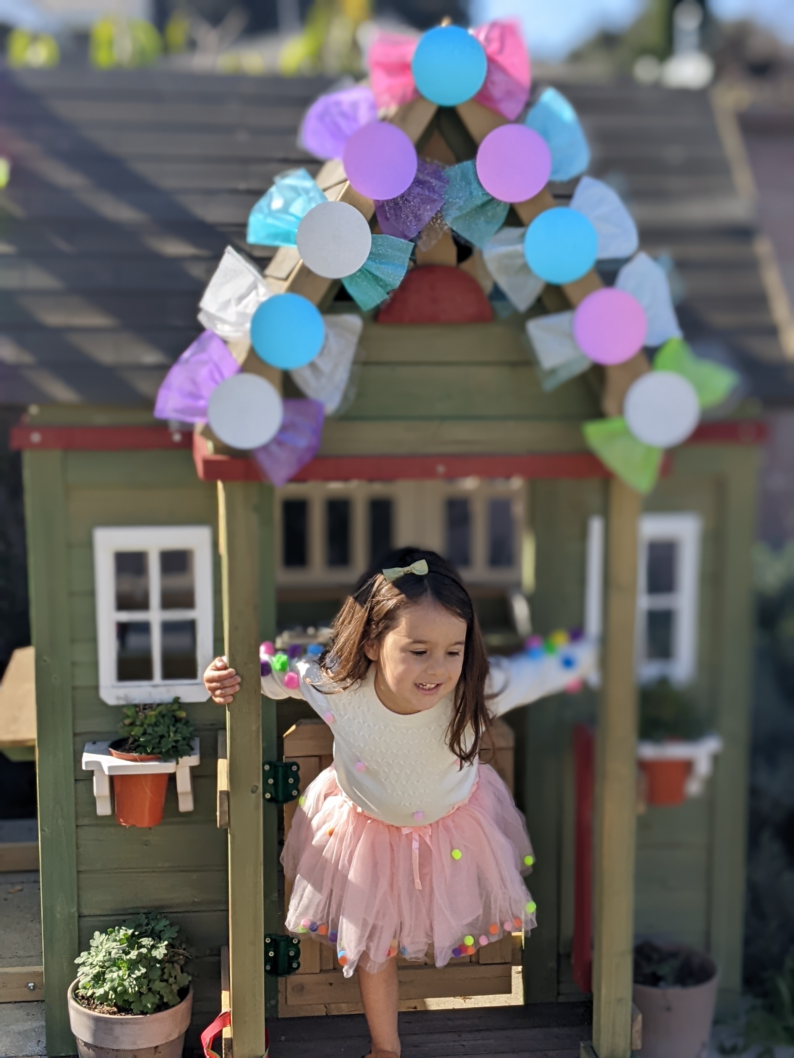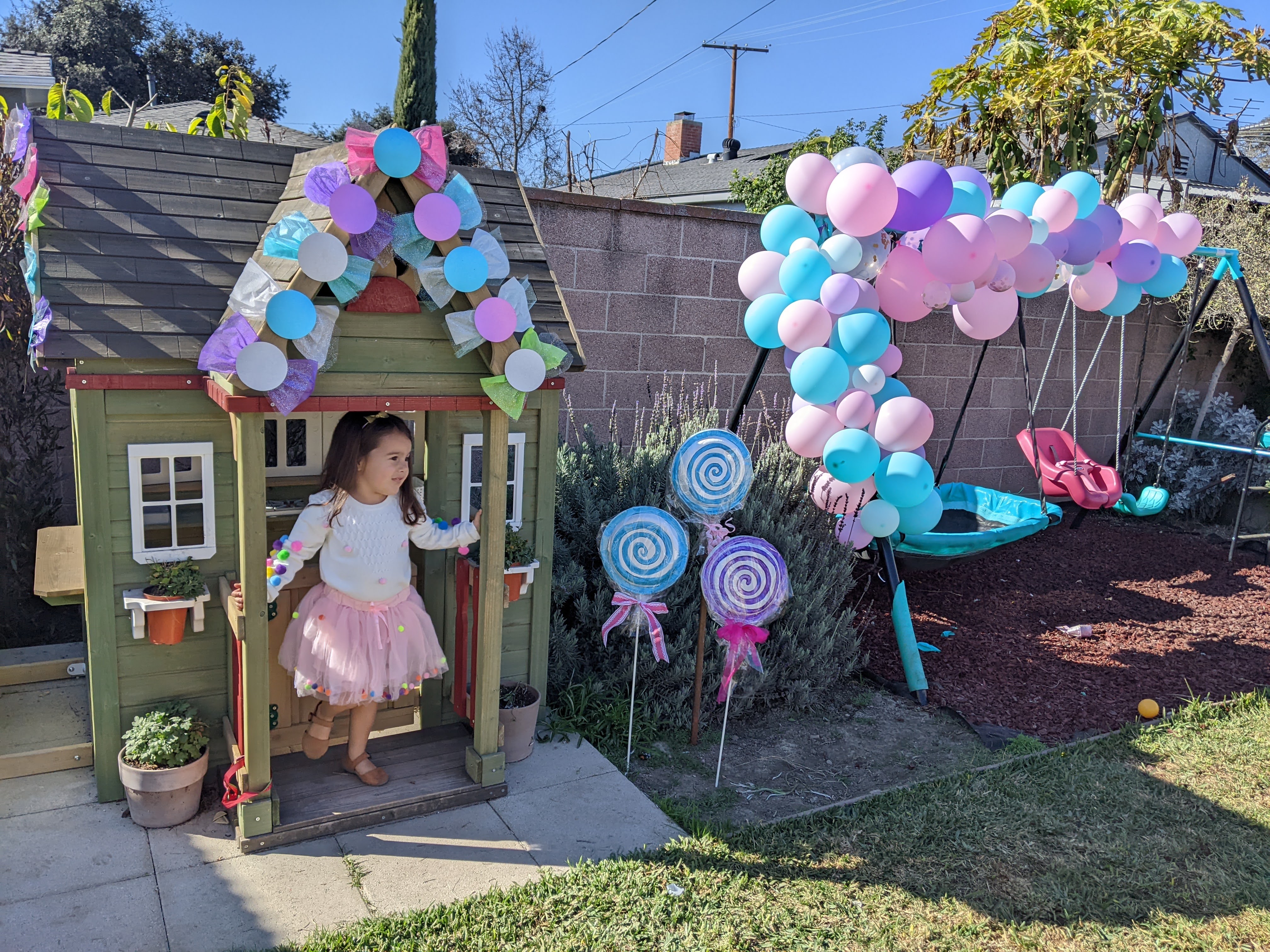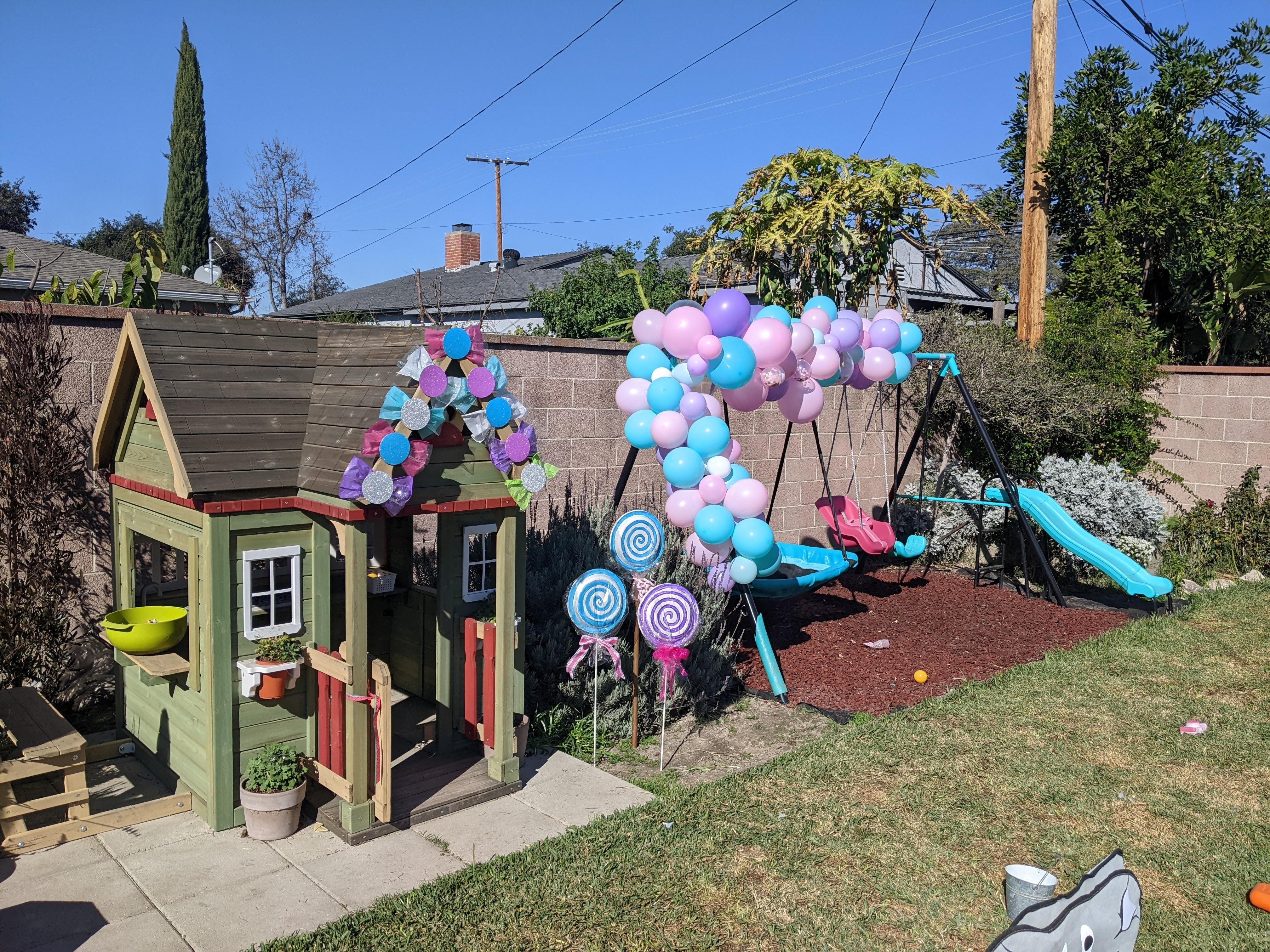 Three and four year olds are relatively good at entertaining each other. It also helps that our backyard has benefitted from 2020 closure sanity purchases. We have a large swing set, a playhouse and a pretty fun cheap stomp rocket. The grandparents gifted her a double sided trampoline (everything seems to have to be for two kids to prevent fights over a single toy and this one is PERFECT). I only had a couple of “organized” activities which I spaced out over the party. The kids were posted up at the dessert table most of the time anyway.