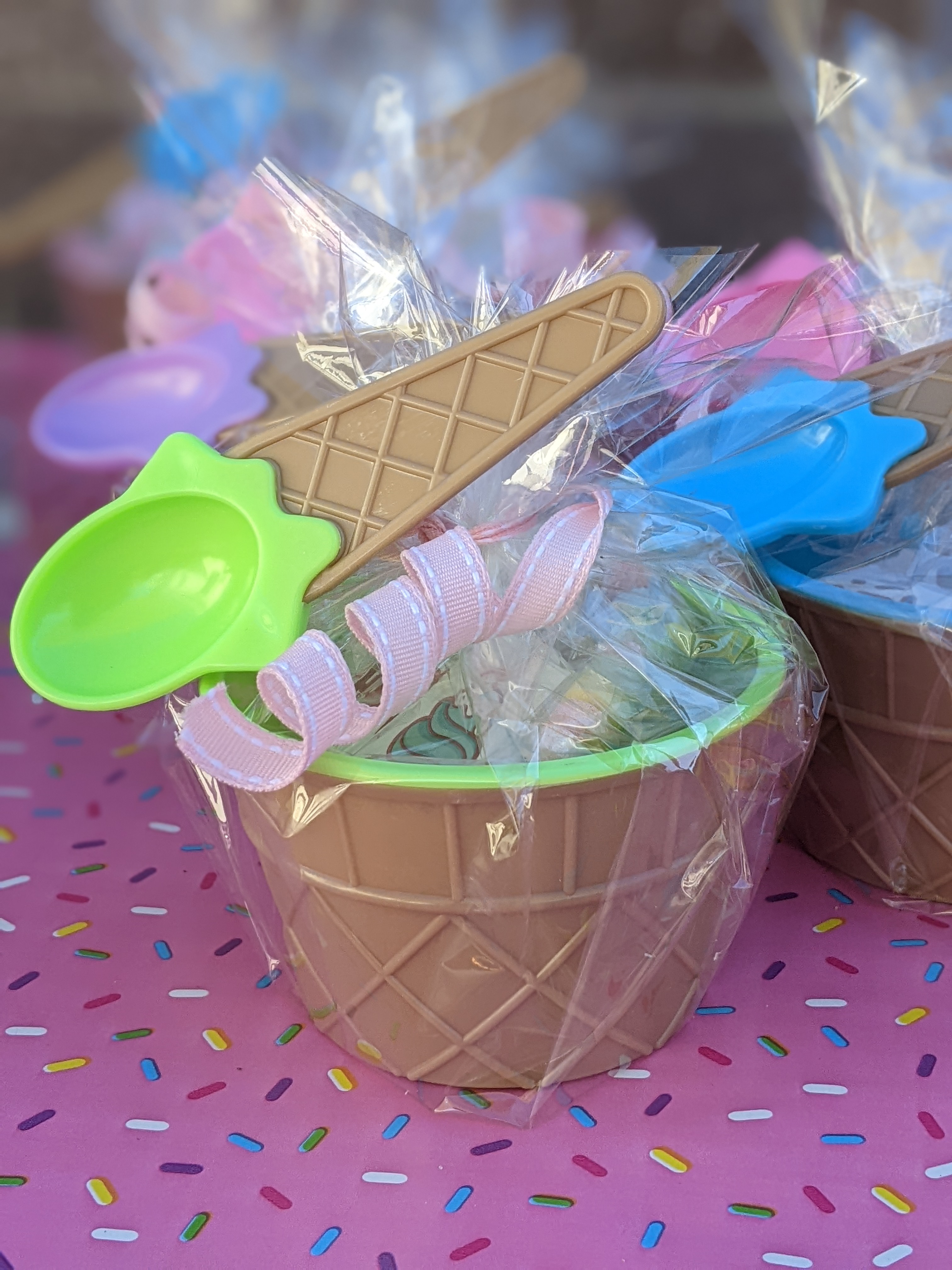 I like to give favors that are with the theme. The last few parties I gave the kiddos books that aligned with the theme (parents loved this). Our party guest list is usually fairly small so I don’t mind doing something a little bigger. This year I gave the kids something I found nostalgic, ice cream cups. I filled each with…yes, more candy! (Again, sorry parents…but the cups are cute!)
